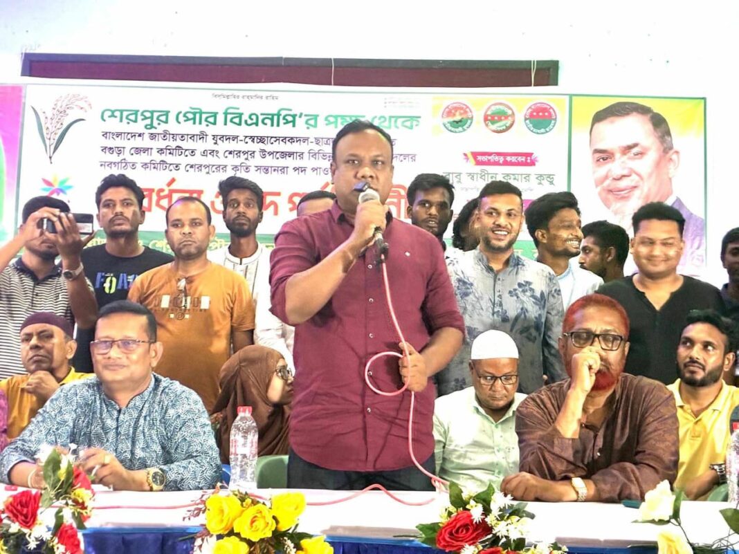 অনুষ্ঠানে শেরপুর পৌর বিএনপির সভাপতি স্বাধীন কুমার কুন্ডুর সভাপতিত্বে নবগঠিত ছাত্রদল, যুবদল ও স্বেচ্ছাসেবক দলের নেতৃবৃন্দকে সংবর্ধনা দেওয়া হয়। এ সময় আরও উপস্থিত ছিলেন পৌর বিএনপির সাধারণ সম্পাদক ফিরোজ আহমেদ জুয়েল, উপজেলা বিএনপির সাংগঠনিক সম্পাদক শফিকুল ইসলাম শফিক, কুসুম্বি ইউনিয়ন পরিষদের চেয়ারম্যান শাহ আলম পান্না, হাসান মারুফ শিমুল, আব্দুর রাজ্জাক, আব্দুল করিম, ফাহমিদুল নবী পাভেল, আনোয়ার হোসেন ও সোয়ানুর রহমান লাভলু প্রমুখ।