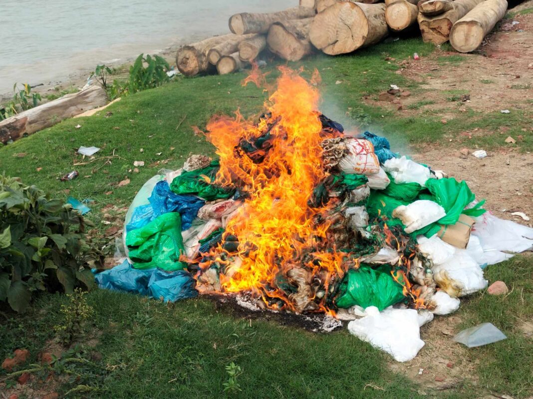 অভিযানে জব্দকৃত পলিথিন পুরিয়ে বিনষ্ট করা হয়।