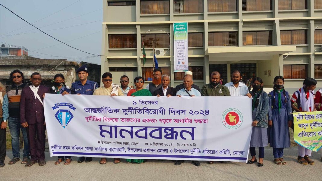 ৯ ডিসেম্বর সোমবার সকালে মোংলা উপজেলা পরিষদ চত্বরে আন্তর্জাতিক দুর্নীতিবিরোধী দিবস উপলক্ষে মানববন্ধনে বক্তারা একথা বলেন। দুর্নীতি দমন কমিশন জেলা কার্যালয় বাগেরহাট, মোংলা উপজেলা প্রশাসন ও মোংলা উপজেলা দুর্নীতি প্রতিরোধ কমিটির আয়োজনে এ মানববন্ধন অনুষ্ঠিত হয়।
