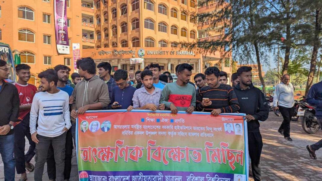২রা ডিসেম্বর সোমবার ভারতের আগরতলায় বাংলাদেশের সহকারী হাইকমিশনে হামলা প্রতিবাদ করে বরিশাল বিশ্ববিদ্যালয়ে বিক্ষোভ করেছে ছাত্রদলের কর্মিরা। মঙ্গলবার (৩ ডিসেম্বর) দুপুর ৩ টায় বিশ্ববিদ্যালয়ের গ্রাউন্ড ফ্লোর থেকে শুরু করে ক্যাম্পাস চারপাশ প্রদক্ষিণ করে বিক্ষোভ মিছিল করে ছাত্রদলের কর্মিরা। এসময় বিক্ষোভকারীরা বাংলাদেশ জিন্দাবাদ, ভারতীয় আগ্রাসন মুর্দাবাদ। ‘ভারতীয় আগ্রাসন, রুখে দাও জনগণ’; ‘দিল্লি না ঢাকা, ঢাকা-ঢাকা’; ‘ভারতীয় আগ্রাসন নিপাত যাক’; ভারতের আগ্রাসন, ভেঙে দাও গুড়িয়ে দাও, গোলামি না আজাদি, আজাদি-আজাদি’; জ্বালো রে জালো, আগুন জ্বালো’ প্রভৃতি স্লোগান দেয় ।