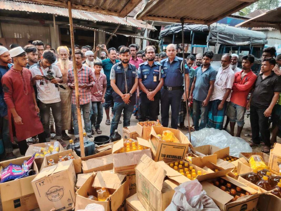 খবর পেয়ে সহকারি পুলিশ সুপার (সালথা – নগরকান্দা) সার্কেল আসাদুজ্জামান শাকিল পুলিশের একটি টিম নিয়ে অভিযান পরিচালনা করেন। পুলিশের এই কর্মকর্তা জানান, ওই ব্যবসায়ী দীর্ঘদিন যাবত পাম্পতৈল বা নিম্নমানের তৈল দিয়ে কেলিকেলাইস্ট করে বোতলজাত করে মোড়ক লাগিয়ে ইচ্ছামতো মেয়াদ উত্তীর্ণের তারিখ বসিয়ে ভোক্তাদের ঠকিয়ে পিওর সয়াবিন বলে বাজারজাত করে আসছিল। সেই সাথে নিম্নমানের পোলাওর চালও প্যাকেটজাত করে বিক্রি করেন তিনি, ডিটারজেন্ট পাউডারেরও মোড়ক জব্দ করা হয় তার কাছ থেকে।