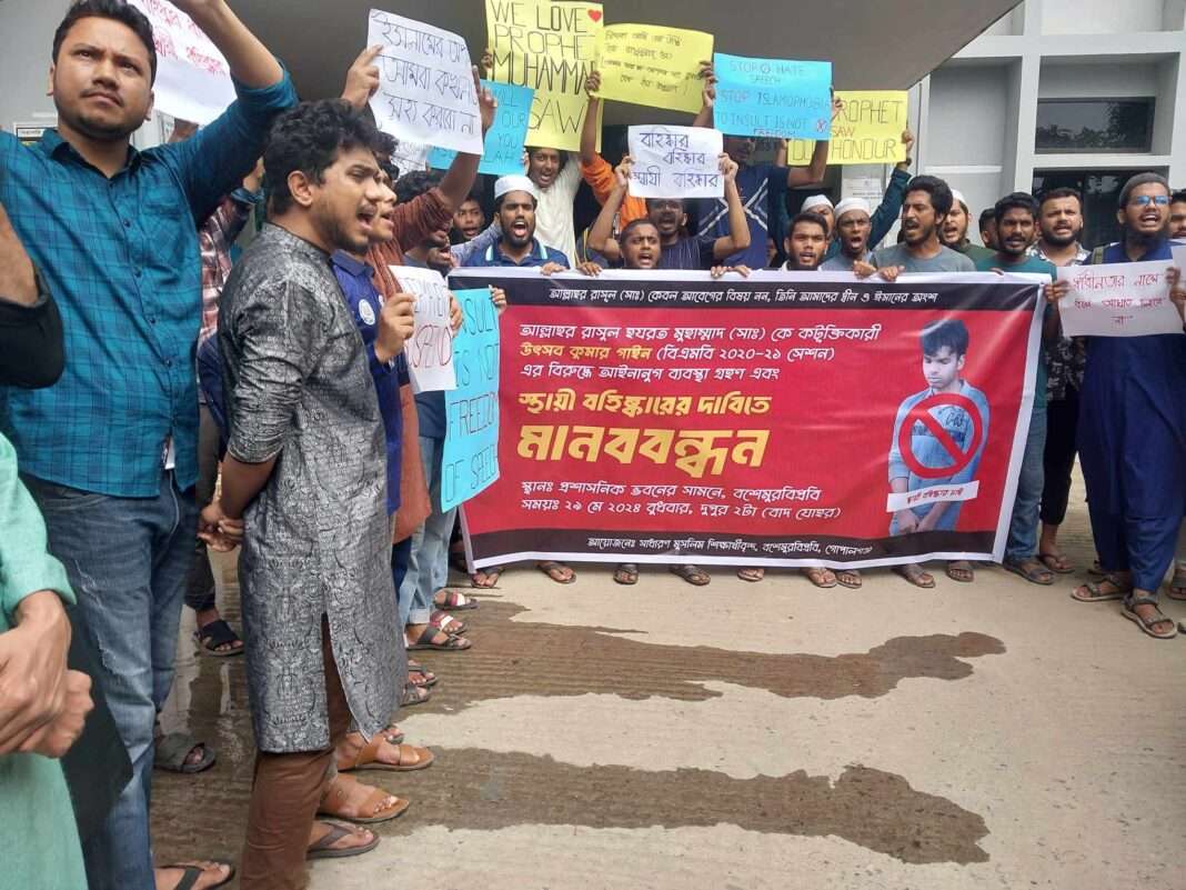 এছাড়াও সাধারণ শিক্ষার্থীরা মহানবী হযরত মুহাম্মদ (সা.) কে নিয়ে কটুক্তিকারী উৎস কুমার গায়নকে স্থায়ী বহিষ্কার না করলে ক্লাস পরীক্ষা বর্জন করার হুঁশিয়ারি দেন।