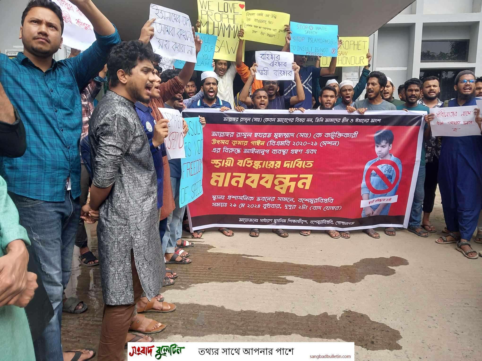 বশেমুরবিপ্রবি প্রতিনিধিঃ গোপালগঞ্জের বঙ্গবন্ধু শেখ মুজিবুর রহমান বিজ্ঞান ও প্রযুক্তি বিশ্ববিদ্যালয়ের (বশেমুরবিপ্রবি) বায়োকেমিস্ট্রি অ্যান্ড মলিকুলার বায়োলজি (বিএমবি) বিভাগের ২০২০-২১ শিক্ষাবর্ষের শিক্ষার্থী উৎস কুমার গায়নের বিরুদ্ধে ইসলামের মহানবী হযরত মোহাম্মদ (সা.) কে নিয়ে কটূক্তির অভিযোগ এনে আইনানুগ ব্যবস্থা গ্রহণ এবং বিশ্ববিদ্যালয় থেকে স্থায়ী বহিষ্কারের দাবিতে বিক্ষোভ মিছিল এবং মানববন্ধন করেছে বিশ্ববিদ্যালয়ের সাধারণ শিক্ষার্থীরা।