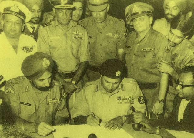 অবশেষে আসে সেই মাহেন্দ্রক্ষণ। ১৯৭১ সালের ১৬ ডিসেম্বর, ঢাকার ঐতিহাসিক রেসকোর্স ময়দানে (বর্তমানে সোহরাওয়ার্দী উদ্যান) পাকিস্তান সেনাবাহিনীর পূর্বাঞ্চলীয় কমান্ডের প্রধান লেফটেন্যান্ট জেনারেল আমির আবদুল্লাহ খান নিয়াজি যৌথ বাহিনীর কমান্ডার লেফটেন্যান্ট জেনারেল জগজিৎ সিং অরোরার কাছে আনুষ্ঠানিকভাবে আত্মসমর্পণ করেন। এই আত্মসমর্পণের দলিল স্বাক্ষরের মাধ্যমে পৃথিবীর বুকে অভ্যুদয় ঘটে স্বাধীন ও সার্বভৌম বাংলাদেশ রাষ্ট্রের।