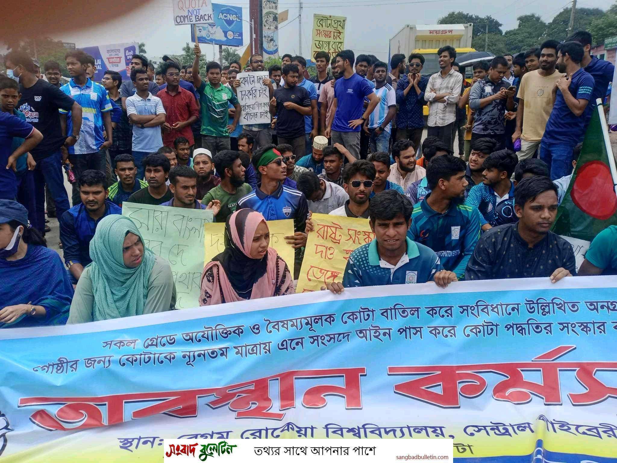 সরকারি চাকরিতে কোটা পদ্ধতি বাতিলের দাবিতে ঢাকা-রংপুর মহাসড়কের রংপুর নগরীর মর্ডান মোড় অবরোধ করেছেন বেগম রোকেয়া বিশ্ববিদ্যালয়ের (বেরোবি) সাধারণ শিক্ষার্থীরা।