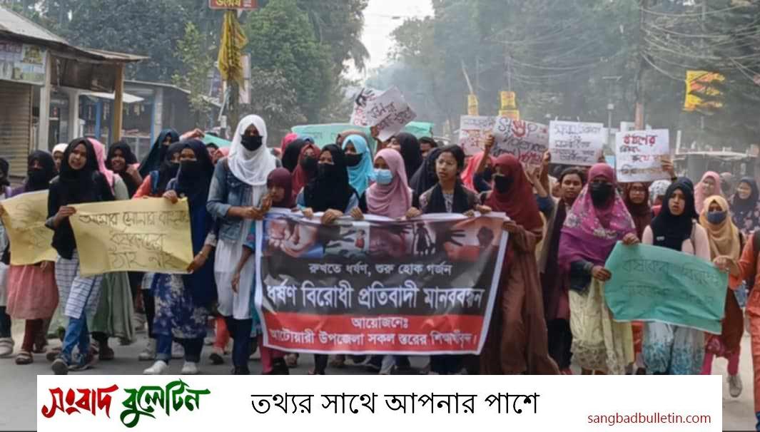 অপরাধীদের শাস্তি চেয়ে আজ মঙ্গলবার (১১ মার্চ) সকালে উপজেলার বিভিন্ন শিক্ষা প্রতিষ্ঠানের শিক্ষার্থীরা আটোয়ারী মডেল পাইলট উচ্চ বিদ্যালয় মাঠে একত্রিত হয়ে “রুখতে ধর্ষণ, শুরু হোক গর্জন” এই স্লোগানকে সামনে রেখে বিভিন্ন ব্যানার, ফেস্টুন ও লিফলেট হাতে নিয়ে তারা একটি বিক্ষোভ মিছিল বের করে।