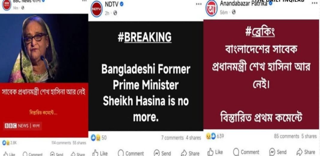 সম্প্রতি সামাজিক মাধ্যমে সাবেক প্রধানমন্ত্রী ফ্যাসিস্ট হাসিনার মৃত্যুর খবর ছড়িয়ে পড়েছে। আন্তর্জাতিক গণমাধ্যম বিবিসি, ভারতের প্রভাবশালী সংবাদ মাধ্যম এনডিটিভি ও কলকাতার আনন্দবাজার পত্রিকার কার্ড শেয়ার করা হয়েছে বেশ কিছু আইডি ও ফেসবুক পেইজ থেকে। যেখানে লেখা বাংলাদেশের সাবেক প্রধানমন্ত্রী শেখ হাসিনা আর বেঁচে নেই। শুধু তাই নয় দেশের একটি পত্রিকারও কার্ড ব্যবহার করা হয়েছে হাসিনার মৃত্যুর বিষয়ে। তবে সত্যিই কি মারা গেছেন হাসিনা? নাকি এটিও গুজব ছাড়া আর কিছুই নয়!