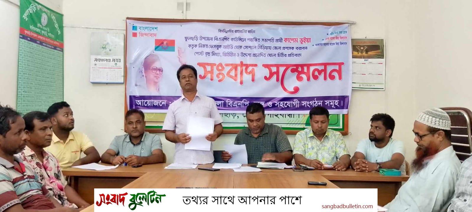 সংবাদ সম্মেলনে বলা হয়, বিগত উপজেলা বিএনপি'র কাউন্সিলে পরাজিত সভাপতি প্রার্থী জনাব কাশেম ভূঁইয়া তার নিজস্ব ফেসবুক একাউন্ট থেকে গত ২১/০৯/২০২৪ইং শনিবার জেলা প্রশাসক বরাবর মিথ্যা বর্ণনায় একটি খোলা চিঠি পোষ্ট করেন। চিঠিতে সামাজিক ও রাজনৈতিক ভাবে হেয় প্রতিপন্ন করা, সেই সাথে বাংলাদেশ জাতীয়তাবাদী দল বিএনপি ফুলছড়ি উপজেলা শাখা অঙ্গ ও সহযোগী সংগঠনের রাজনৈতিক সুনাম ও মর্যাদাকে ক্ষতিগ্রস্থ করার লক্ষে মিথ্যা বর্ণনায় একটি অসত্য খোলা চিঠি জেলা প্রশাসক বরাবর পোষ্ট করা হয়। খোলা চিঠিতে জেলা প্রশাসককে যেসব অভিযোগের বর্ণনা সৃজন করেছেন তা সম্পূর্ণ মিথ্যা, ভিক্তিহীন ও উদ্দেশ্য প্রণীত। চিঠিতে দলীয় ও বিএনপিসহ অঙ্গ ও সহযোগী সংগঠনকে দোষারোপ করে দলের প্রতি চরম আস্থাহীনতার পরিচয় দিয়েছেন। সেই সাথে দেশনায়ক বিএনপি'র ভারপ্রাপ্ত চেয়ারম্যান জনাব তারেক রহমানের নেতৃত্ব ও সুনামকে ব্যাপক ভাবে ক্ষতিগ্রস্থ করেছেন।