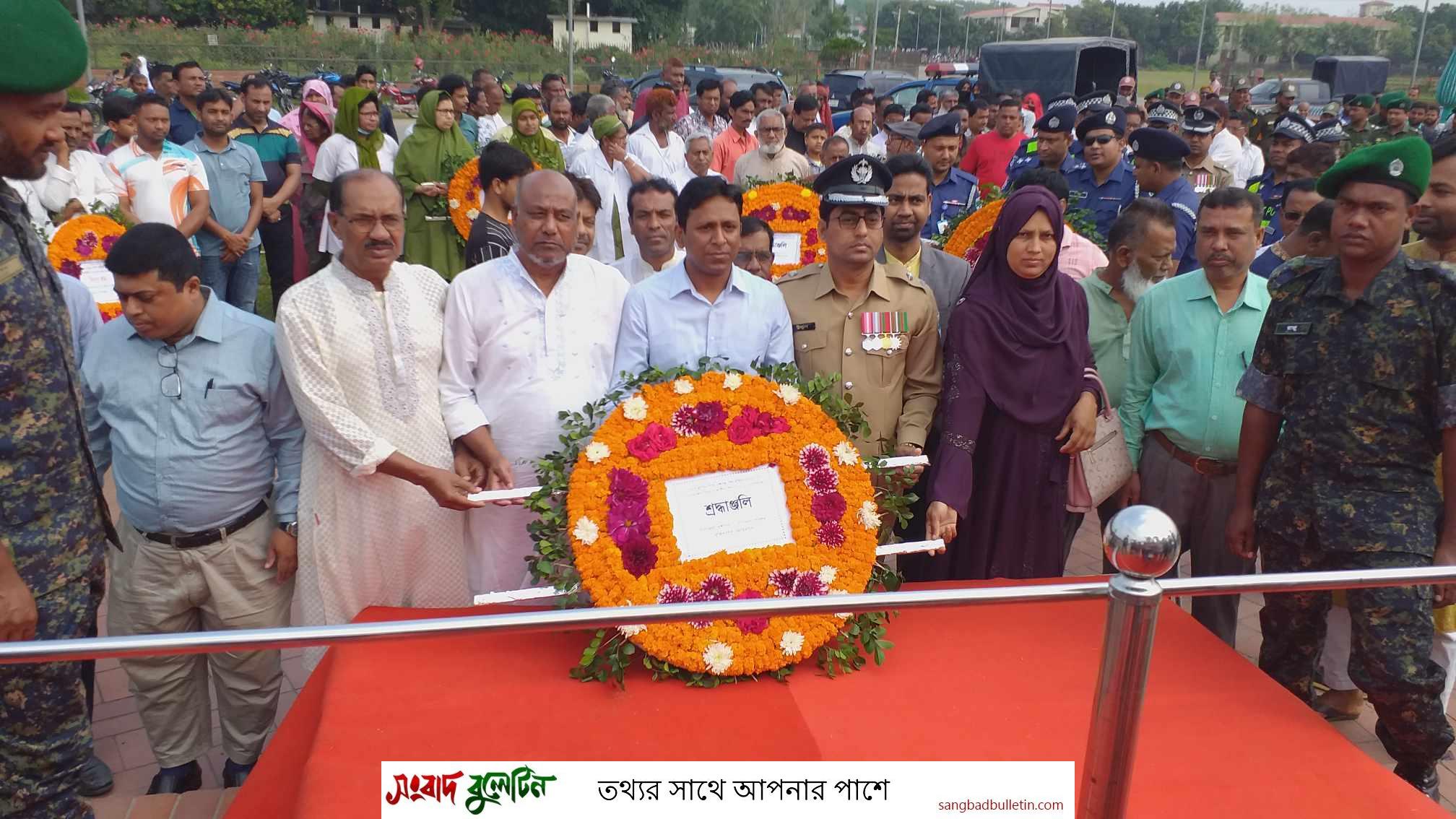 পরে পর্যায়ক্রমে জেলা পুলিশের পক্ষে পুলিশ সুপার এস এম নাজমুল হক , মেহেরপুর জেলাপরিষদের পক্ষে জেলা পরিষদের চেয়ারম্যান আব্দুস সালাম ,পৌরসভার পক্ষে পৌর মেয়র মোঃ মাহাফুজর রহমান রিটন,মেহেরপুর স্বাস্থ্য বিভাগের পক্ষে সিভিল সার্জন ডাঃঅলোক কুমার দাস , মেহেরপুর জেলা আওয়ামী লীগের পক্ষে সহ-সভাপতি আব্দুস ছামাদ বাবলু বিশ্বাস, জেলা আনসার ও ভিডিপির পক্ষে জেলা কমান্ড্যান্ট প্রদীপ চন্দ্র দত্ত,মেহেরপুর সদর উপজেলা পরিষদের পক্ষে ভারপ্রাপ্ত উপজেলা চেয়ারম্যান লতিফন নেছা লতা, উপজেলা প্রশাসনের পক্ষে সদর উপজেলা নির্বাহী কর্মকর্তা ডা.কাজী নাজিব হাসান , জেলা যুবলীগের পক্ষে আহবায়ক মাহাফুজর রহমাম রিটন, যুব মহিলা লীগের পক্ষে রোজিনা খাতুন, মেহেরপুর গণপূর্ত বিভাগের পক্ষে নির্বাহী প্রকৌশলী সম্ভু রাম পাল, মেহেরপুর সরকারি কলেজের পক্ষে অধ্যক্ষ মেহেরপুর সরকারি মহিলা কলেজের পক্ষে ভারপ্রাপ্ত অধ্যক্ষ আশরাফুল আলম,জেলা যুব উন্নয়ন অধিদপ্তরের পক্ষে উপ-পরিচালক ফিরোজ আহমেদ , মহিলা বিষয়ক অধিদপ্তর, সমাজসেবা অধিদপ্তরের পক্ষে উপ-পরিচালক নীলা হাফিয়া,মেহেরপুর পাবলিক লাইব্রেরির পক্ষে পিপিপল্লব ভট্টাচার্য, সমবায় অফিসের পক্ষে রোকনুজ্জামান তুষার, মেহেরপুর জেলা শিল্পকলা একাডেমীর পক্ষে সাইদুর রহমান , মেহেরপুর জেলা আইনজীবী সমিতির পক্ষে পিপি পল্লব ভট্টাচার্য, মেহেরপুর জেলা ক্রীড়া অফিসের পক্ষে মামুনুর রশিদ ,টিটিসি’র অধক্ষ্য আরিফ হোসেন তালুকদার, জেলা শিক্ষা অফিসের পক্ষে শিক্ষা অফিসার আব্বাস উদ্দীন, জেলা মাদক দ্রব্য নিয়ন্ত্রণ অধিদপ্তরের সহকারী পরিচালক শিরনা আক্তার , জেলা নিরাপদ খাদ্য কর্মকর্তা রিয়াজ মাহামুদ, ফায়ার সার্ভিস ও সিভিল ডিফেন্সের স্টেশন অফিসার শামীম রেজা,জেলা ছাত্রলীগের পক্ষে জেলা ছাত্রলীগের সভাপতি আব্দুল সালাম বাঁধনসহ মেহেরপুর জেল পুলিশ, পিটিআই, জনস্বাস্থ্য বিভাগ, এলজি ইডি, কৃষি বিভাগ,প্রানী সম্পদ বিভাগ, পানি উন্নয়ন বোর্ড, বিআরটিএ, সহ বিভিন্ন সামাজিক প্রতিষ্ঠানের পক্ষ থেকে পৃথক পৃথকভাবে পুষ্প মাল্য অর্পণ করা হয়। পরে জাতির পিতা বঙ্গবন্ধু শেখ মুজিবুর রহমানের শান্তি কামনায় দোয়া অনুষ্ঠিত হয়।