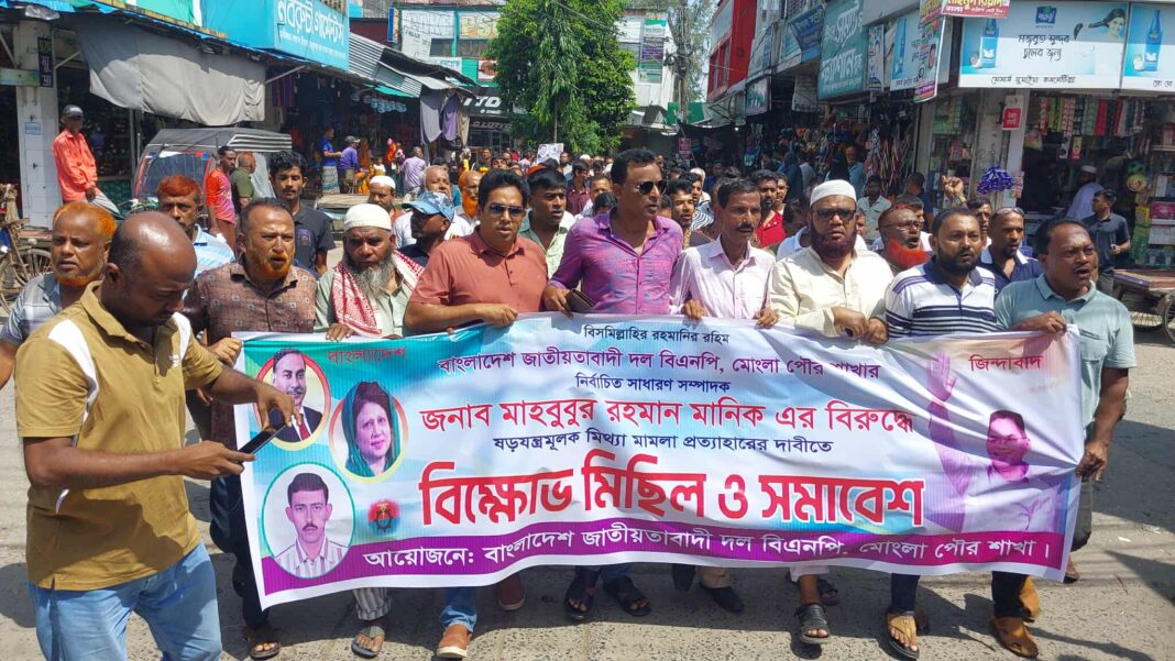 মো: হাছিব সরদার, মোংলা সংবাদদাতা: মোংলায় পৌর বিএনপির সাধারন সম্পাদক মাহবুবুর রহমান মানিকের বিরুদ্ধে সন্ত্রাসী হামলা দায়ের হওয়া মামলার প্রতিবাদে স্থানীয় বিএনপি ও দলের অঙ্গ সংগঠনের নেতৃবৃন্দের উদ্যোগে বিক্ষোভ ও প্রতিবাদ সমাবেশ অনুষ্ঠিত হয়েছে।