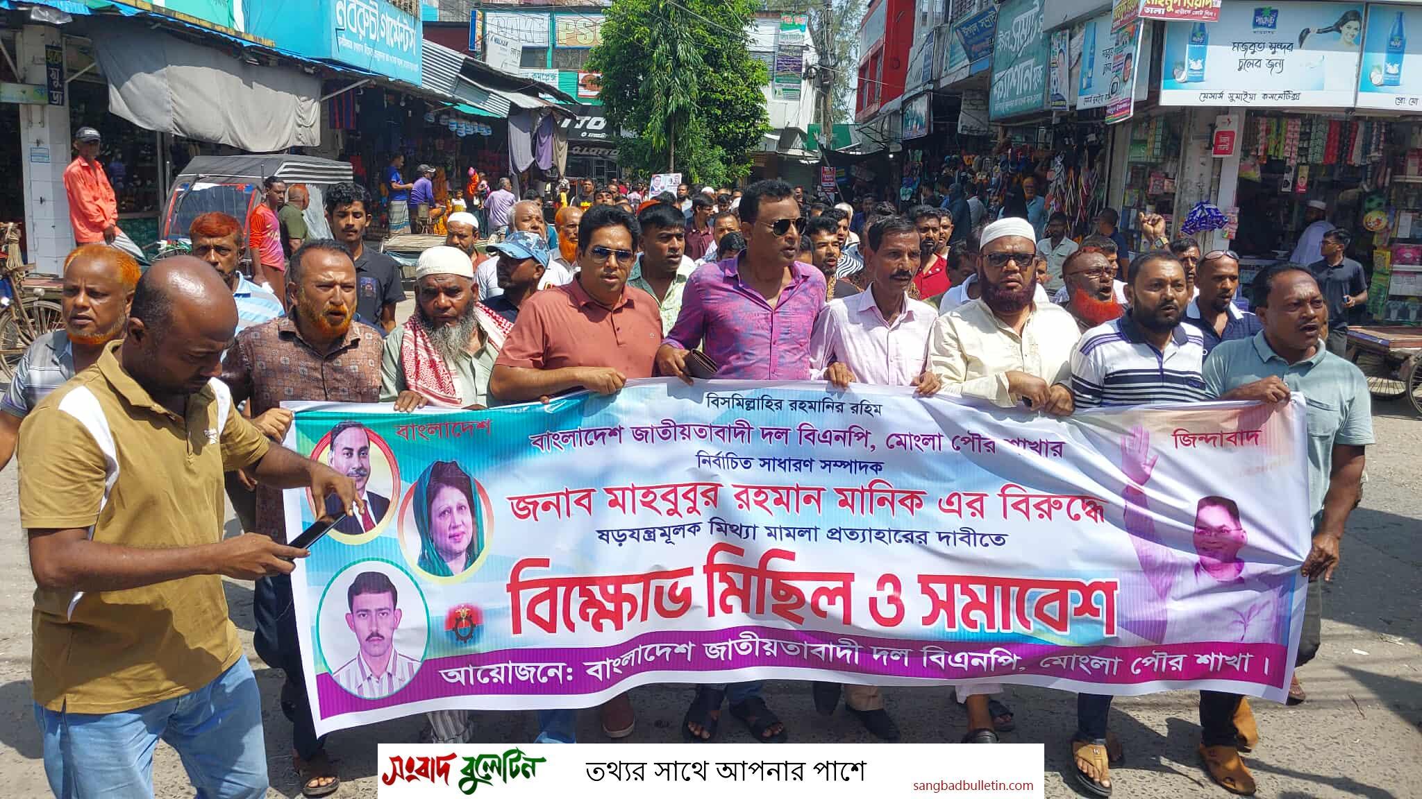 মো: হাছিব সরদার, মোংলা সংবাদদাতা: মোংলায় পৌর বিএনপির সাধারন সম্পাদক মাহবুবুর রহমান মানিকের বিরুদ্ধে সন্ত্রাসী হামলা দায়ের হওয়া মামলার প্রতিবাদে স্থানীয় বিএনপি ও দলের অঙ্গ সংগঠনের নেতৃবৃন্দের উদ্যোগে বিক্ষোভ ও প্রতিবাদ সমাবেশ অনুষ্ঠিত হয়েছে।