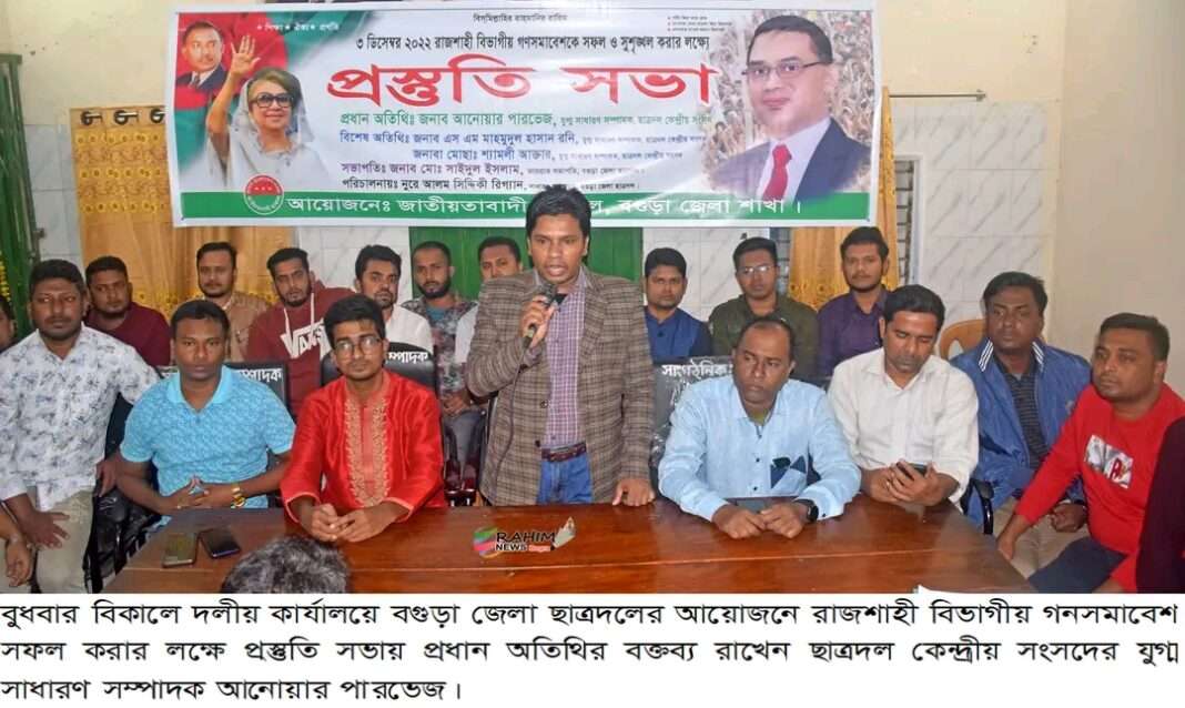 বিএনপির রাজশাহী বিভাগীয় গণসমাবেশ সফল করার লক্ষে বগুড়ায় ছাত্রদলের প্রস্তুতি সভা অনুষ্ঠিত হয়েছে। বুধবার বিকালে দলীয় কার্যালয়ে জেলা ছাত্রদলের ভারপ্রাপ্ত সভাপতি সাইদুল ইসলাম সভাপতিত্বে ও সাধারণ সম্পাদক নূরে আলম সিদ্দিকী রিগ্যানের পরিচালনায় প্রস্তুতি সভায় প্রধান অতিথির বক্তব্য রাখেন ছাত্রদল কেন্দ্রীয় সংসদের যুগ্ম সাধারণ সম্পাদক আনোয়ার পারভেজ। বিশেষ অতিথি ছিলেন ছাত্রদল কেন্দ্রীয় সংসদের যুগ্ন সাধারণ সম্পাদক এস এম মাহমুদুল হাসান রনি। প্রস্তুতি সভায় জেলা ছাত্রদলের ২৮ টি ইউনিটের নেতৃবৃন্দ উপস্থিত ছিলেন।