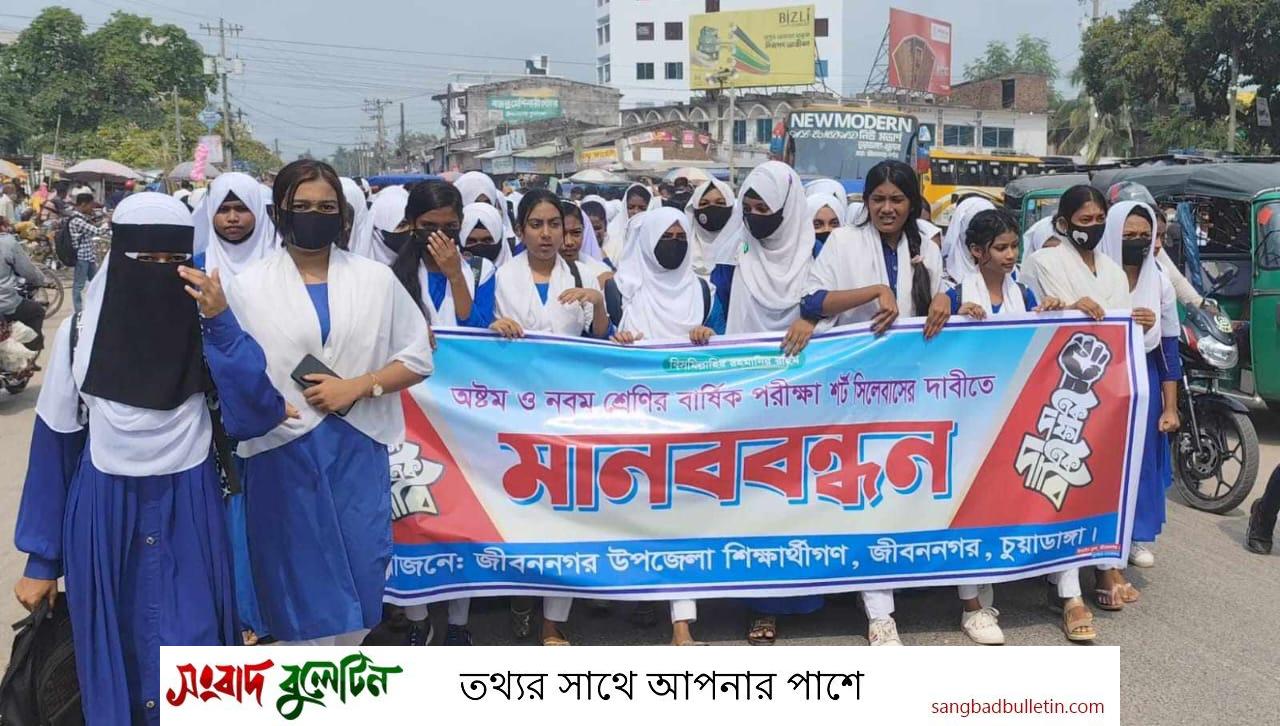 এক দফা, এক দাবি অষ্টম ও নবম শ্রেণির বার্ষিক পরীক্ষার যৌক্তিক শর্ট সিলেবাস চাই।’ এই স্লোগানকে সামনে রেখে চুয়াডাঙ্গার জীবননগরের শিক্ষার্থীরা মানববন্ধন কর্মসূচি পালন করেছে। গতকাল আজ সকাল ১০টার দিকে জীবননগর বাসস্ট্যান্ড চত্বরে এই মানববন্ধন অনুষ্ঠিত হয়। মানববন্ধনে অংশ নেয় জীবননগর সরকারি মাধ্যমিক বালিকা বিদ্যালয়, জীবননগর থানা পাইলট মাধ্যমিক বিদ্যালয় ও শাপলাকলি আদর্শ মাধ্যমিক বিদ্যালয়ের ছাত্র-ছাত্রীরা। এ সময় শিক্ষার্থীরা জীবননগর শহরের প্রধান প্রধান সড়ক প্রদিক্ষণ করে মুক্তমঞ্চে একত্রিত হয়। শিক্ষার্থীরা বিভিন্ন স্লোগানের মাধ্যমে তারা তাদের দাবি তুলে ধরেন। শিক্ষার্থীদের পক্ষে শোভা বলেন, সারা দেশের ন্যায় আমাদের জীবননগরেও এই মানববন্ধন অনুষ্ঠিত হচ্ছে। এই মানববন্ধনের মাধ্যমে প্রধান উপদেষ্টার কাছে আবেদন করছি আমাদের অষ্টম ও নবম শ্রেণীর সিলেবাস শর্ট করার জন্য। শিক্ষার্থীদের পক্ষে নাঈম বলেন, অষ্টম ও নবম শ্রেণীর শর্ট সিলেবাস জন্য আমরা মানববন্ধন করছি। অতি দ্রুত আমাদের বার্ষিক পরীক্ষার শর্ট সিলেবাস প্রকাশ না করা হয় তাহলে আমরা রাজপথে কঠোর আন্দোলনে নামবো। তিনি আরো বলেন, আমরা আমাদের এক দফা এক দাবি নিয়ে রাস্তায় নেমেছি। এতে অনেকে খারাপ বলবে, অনেকে ভালো বলবে। কিন্তু আমরা জানি এইসব সিলেবাস আমাদের জন্য কতটা প্রয়োজন।
