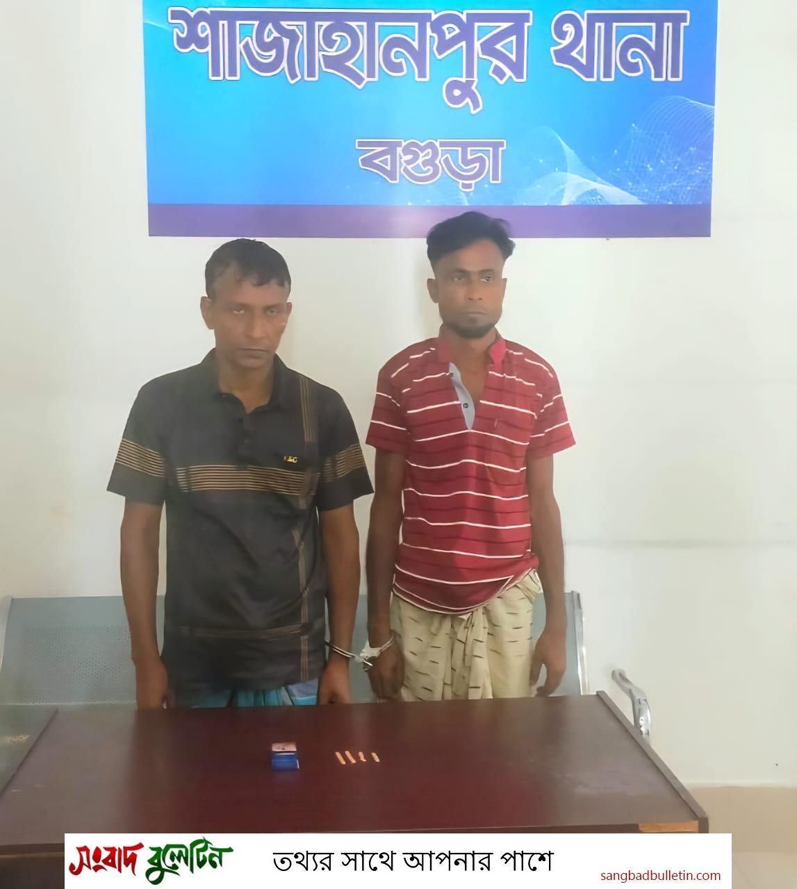 বৃহস্পতিবার (৪ জুলাই) রাত ৯টার দিকে শাজাহানপুর থানার উপপরিদর্শক (নিঃ) মো. নুরুল ইসলাম সঙ্গীয় অফিসার ও ফোর্সের সহায়তায় গোহাইল ইউনিয়নের পালাহার গ্রামস্থ শাহিন মেম্বারের বাড়ির দক্ষিণ পাশের ইটের ছলিং রাস্তা থেকে তাদের গ্রেফতার করেন।
