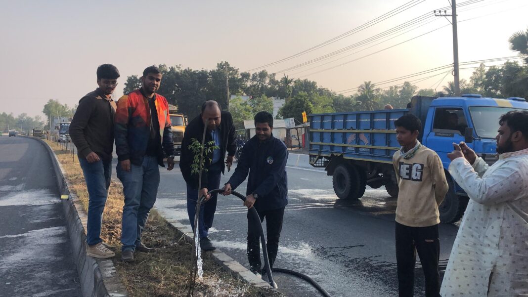 শাজাহানপুরের বৃক্ষপ্রেমি আরিফুলের উদ্যাগে মহাসড়কে ডিভাইডারের মধ্যে গাছগুলোকে বাঁচাতে  পানি দেয়া হয়।