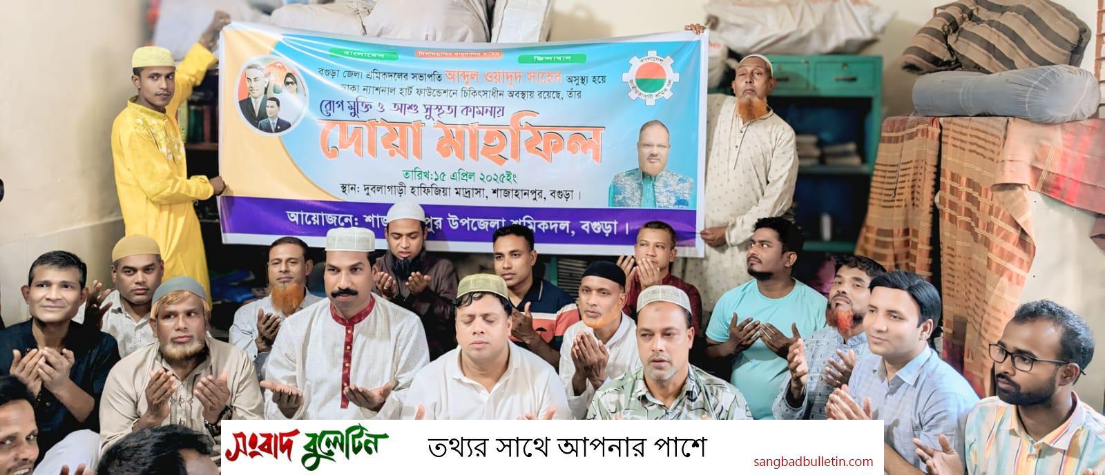 বগুড়া জেলা শ্রমিক দলের সভাপতি আব্দুল ওয়াদুদের রোগ মুক্তি কামনায় শাজাহানপুর উপজেলায় শ্রমিক দলের আয়োজনে দোয়া মাহফিল অনুষ্ঠিত হয়েছে।