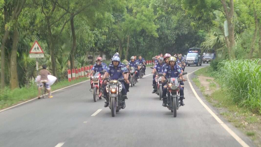 মঙ্গলবার বিকালে থানার অফিসার ইনচার্জ (ওসি) শহিদুল ইসলামের নেতৃত্বে একদল পুলিশ মোটরসাইকেল ও পিকআপভ্যান নিয়ে উপজেলার বিভিন্ন এলাকায় সাইরেন বাজিয়ে মহড়া দেয়।