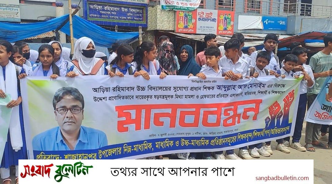 শাজাহানপুরে প্রধান শিক্ষক মোনায়েমের মুক্তির দাবিতে বিক্ষোভ ও মানববন্ধন