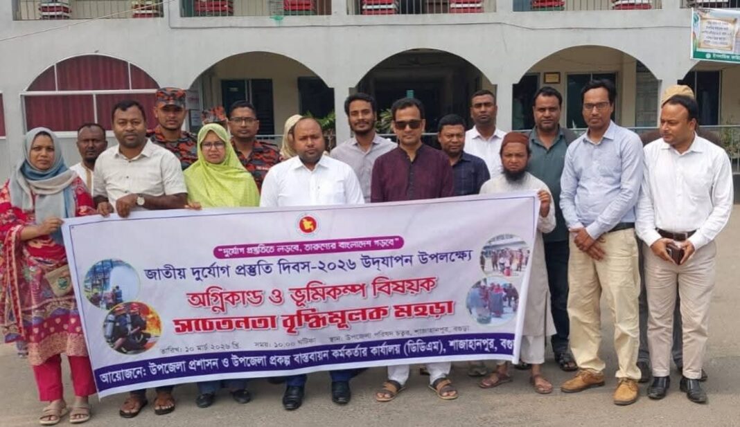 জাতীয় দুর্যোগ প্রস্তুতি দিবস উপলক্ষে বগুড়ার শাজাহানপুরে ভূমিকম্প ও অগ্নিকাণ্ড মোকাবিলায় সচেতনতামূলক মহড়া অনুষ্ঠিত হয়েছে।