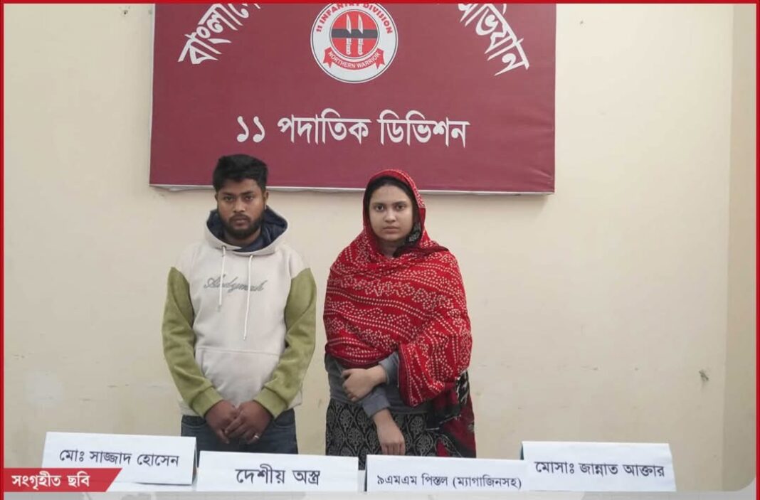 গ্রেফতার সাজ্জাদ হোসেন বয়রাদীঘি গ্রামের আহাদ আলীর ছেলে। তার সঙ্গে গ্রেপ্তার হয়েছেন তার স্ত্রী ও সহযোগী জান্নাত আক্তার। এ সময় তাদের কাছ থেকে জার্মানির তৈরি একটি পিস্তল ও দেশীয় অস্ত্র জব্দ করা হয়।