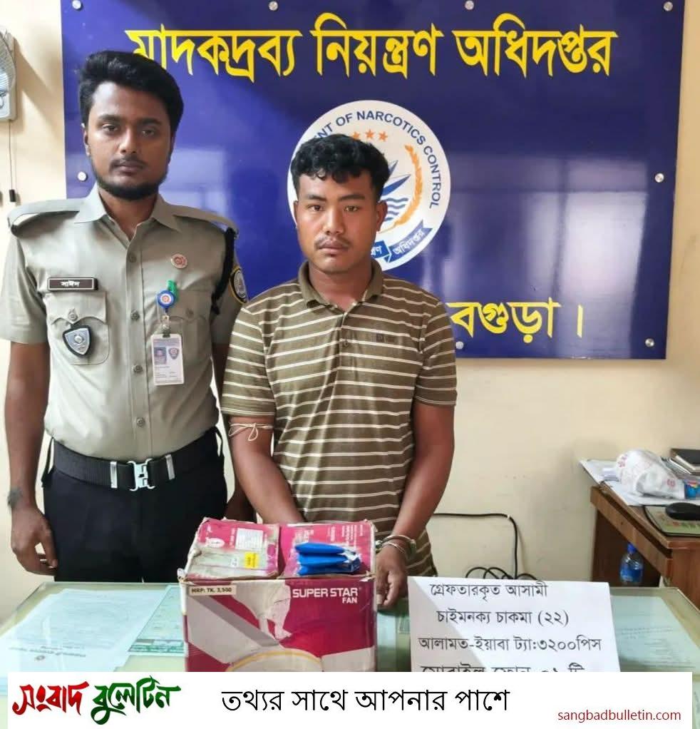 বগুড়ার শাজাহানপুরে ৩ হাজার ২০০ পিস ইয়াবা ট্যাবলেটসহ চাইমনক্য চাকমা (২২) নামে এক যুবককে গ্রেফতার করেছে মাদকদ্রব্য নিয়ন্ত্রণ অধিদপ্তর।