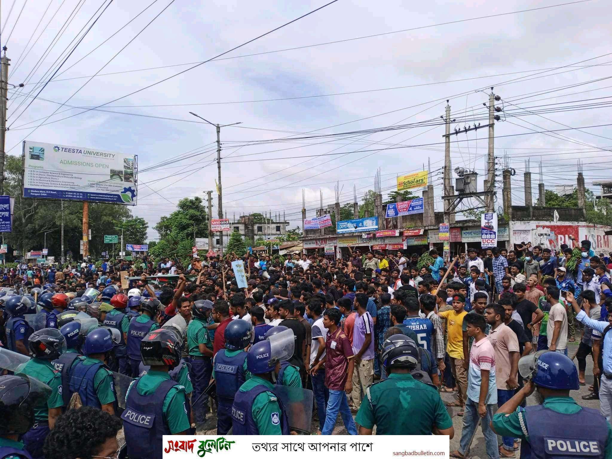এর আগে, দুপুর ২টার দিকে রংপুরের খামার মোড় থেকে শিক্ষার্থীরা বিশাল মিছিল নিয়ে বিশ্ববিদ্যালয়ের এক নম্বর ফটকের সামনে আসেন। এ সময় তারা বিভিন্ন স্লোগান দিতে থাকেন। শিক্ষার্থীরা ক্যাম্পাসে প্রবেশের চেষ্টা করলে পুলিশ বাধা দেয়। এতে পুলিশের সঙ্গে শিক্ষার্থীদের সংঘর্ষ বাধে। এ সময় পুলিশ প্রায় ২০০ রাউন্ড গুলি ও রাবার বুলেট ছোড়ে। পুলিশের গুলিতে বিশ্ববিদ্যালয়ের ইংরেজি বিভাগের শিক্ষার্থী আবু সাইদ নিহত হন।