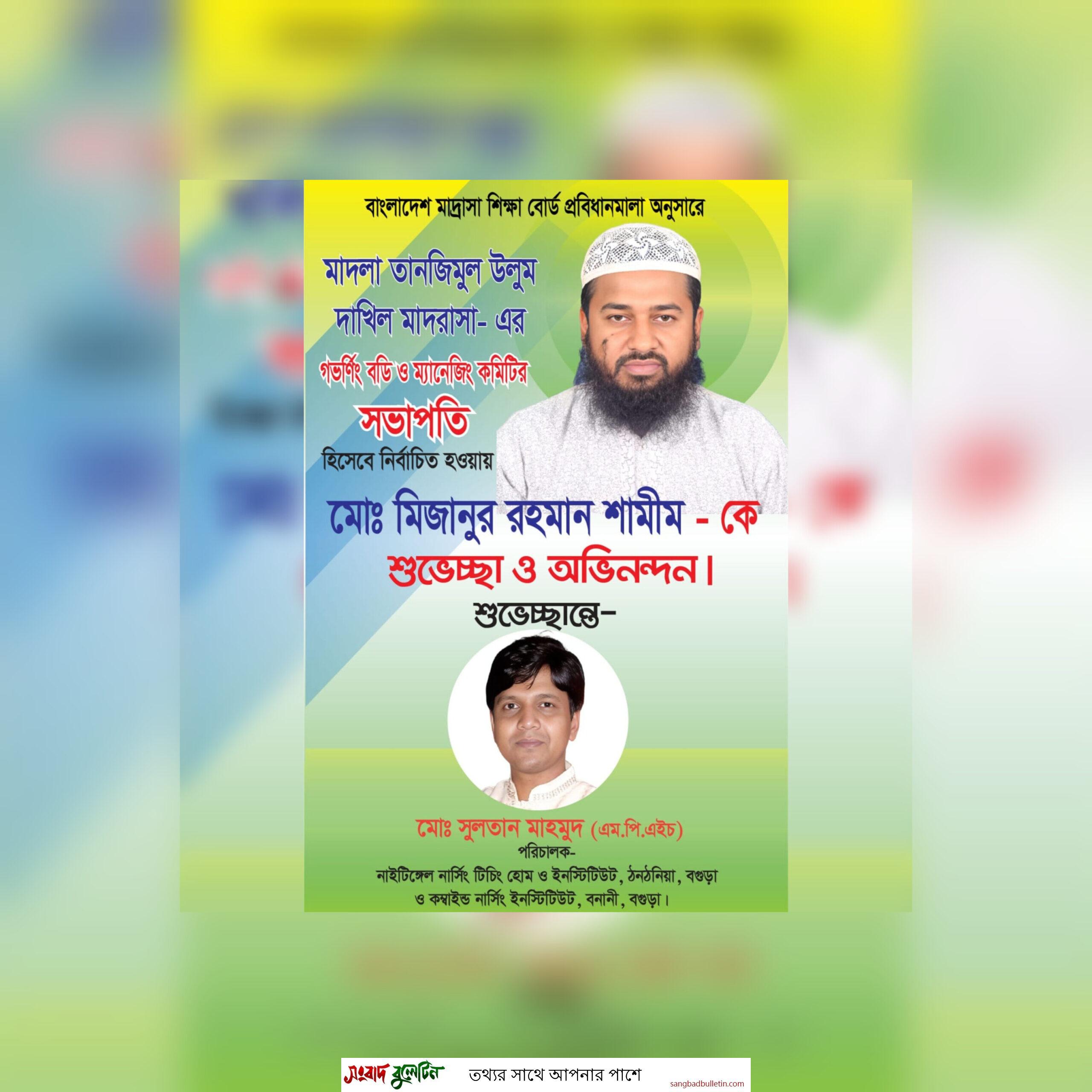 বাংলাদেশ মাদ্রাসা শিক্ষা বোর্ডের প্রবিধানমালা অনুসারে মাদলা তানজিমুল উলুম দাখিল মাদ্রাসার গভর্ণিং বডি ও ম্যানেজিং কমিটির সভাপতি হিসেবে মো:মিজানুর রহমান শামীম নির্বাচিত হয়েছেন। এ উপলক্ষে তাকে শুভেচ্ছা ও আন্তরিক অভিনন্দন জানিয়েছেন নাইটিঙ্গেল নার্সিং টিচিং হোম ও ইনস্টিটিউট এবং কম্বাইন্ড নার্সিং ইনস্টিটিউটের পরিচালক মো: সুলতান মাহমুদ।