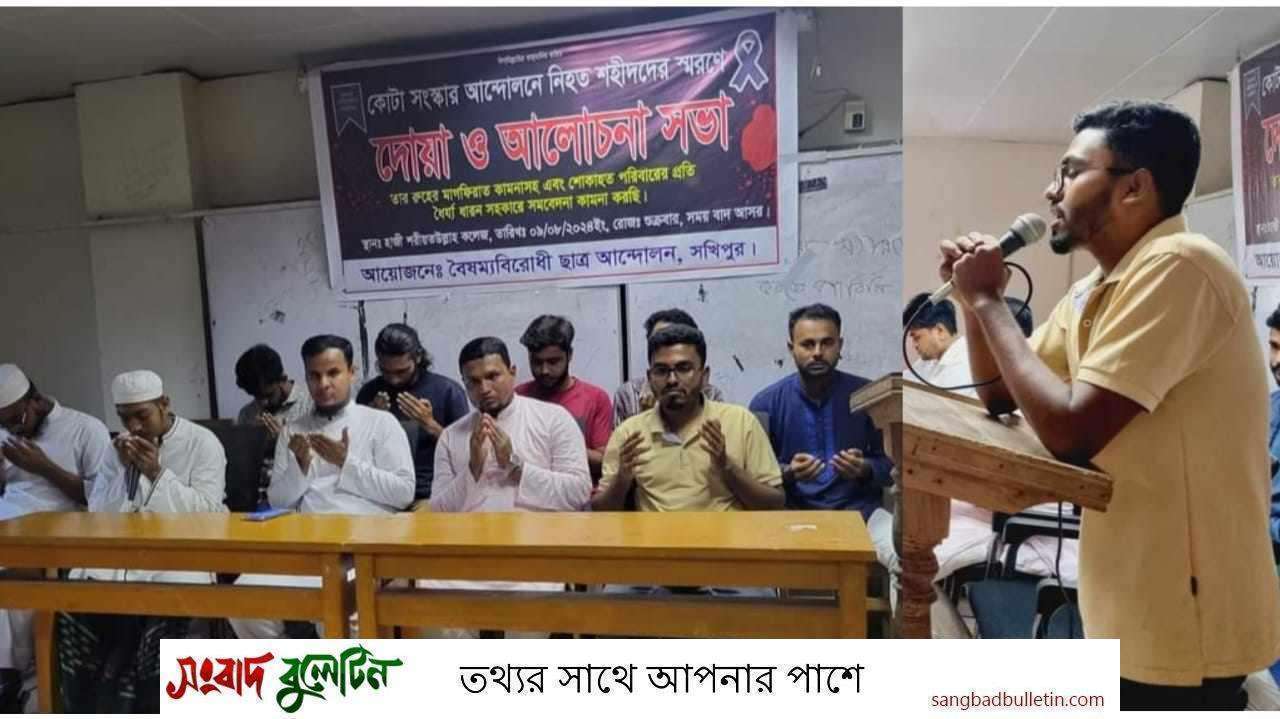 শরীয়তপুরের সখিপুরে বৈষম্যবিরোধী ছাত্র আন্দোলনে নিহত শহীদদের স্মরণে দোয়া ও আলোচনা সভা অনুষ্ঠিত হয়েছে। শুক্রবার (৯ আগস্ট) বাদ আসর হাজী শরীয়তউল্যাহ কলেজ প্রাঙ্গণে এ দোয়া ও আলোচনা সভা অনুষ্ঠিত হয়। শরীয়তপুর জেলা বৈষম্যবিরোধী ছাত্র আন্দোলনের সমন্বয়ক রহমতউল্লা নিহালের সভাপতিত্বে অনুষ্ঠানে
