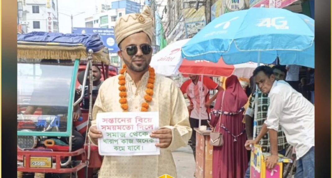 সন্তানদের সময়মতো বিয়ের দাবিতে বর সেজে রংপুরে এক অভিনব প্রতিবাদ করেছেন রেজা নামের এক যুবক। মঞ্চ নাটকের সঙ্গে যুক্ত এই যুবকের বাড়ি রংপুর সিটি কর্পোরেশনের আমাশু কুকরুল এলাকায়। তিনি নিজেও এখনও বিয়ে করেননি। বৃহস্পতিবার (৯ অক্টোবর) দুপুরে রংপুর প্রেসক্লাবের সামনে এই অভিনব প্রতিবাদ করেন তিনি।