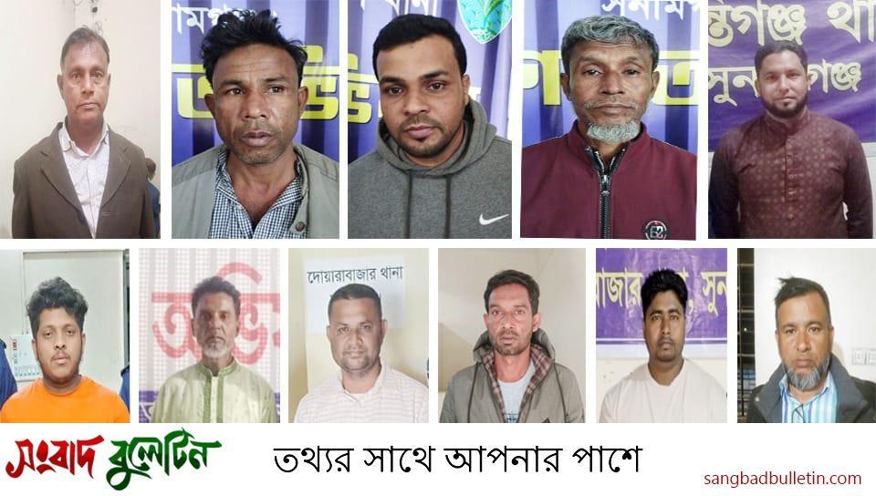 গ্রেফতারকৃতরা হলেন— শান্তিগঞ্জ থানাধীন তেহকিয়া গ্রামের বাসিন্দা, পাথারিয়া ইউনিয়ন আওয়ামী লীগের সাধারণ সম্পাদক মো: নুর আলম (৪২), সুনামগঞ্জ সদর থানাধীন ষোলঘর এলাকার বাসিন্দা, সুনামগঞ্জ পৌরসভার সাবেক ওয়ার্ড কাউন্সিলর মো: কাওছার (৩৩), সুনামগঞ্জ সদর থানাধীন বনগাঁও গ্রামের বাসিন্দা, রঙ্গারচর ইউনিয়ন যুবলীগের সাংস্কৃতিক বিষয়ক সম্পাদক তাজউদ্দিন (৪৫), সুনামগঞ্জ সদর থানাধীন বৃন্দাবন নগর গ্রামের বাসিন্দা, রঙ্গারচর ইউনিয়নের ৫নং ওয়ার্ড আওয়ামী লীগের সহ—সভাপতি মনির হোসেন (৩৫), জগন্নাথপুর থানাধীন পাড়ারগাঁও গ্রামের বাসিন্দা, কলকলিয়া ইউনিয়ন আওয়ামী লীগের যুব ও ক্রীড়া বিষয়ক সম্পাদক হারুন মিয়া (৪২), দোয়ারাবাজার থানাধীন যোগীরগাঁও গ্রামের বাসিন্দা, দোয়ারাবাজার উপজেলা আওয়ামী লীগের আহ্বায়ক কমিটির সদস্য বাবুল মিয়া (৪০), দোয়ারাবাজার থানাধীন ভাঙ্গাপাড়া গ্রামের বাসিন্দা, দোয়ারাবাজার উপজেলা ছাত্রলীগের আহ্বায়ক কমিটির যুগ্ম আহ্বায়ক আব্দুল্লা আল মামুন (২৮), ছাতক থানাধীন মুক্তিরগাঁও গ্রামের বাসিন্দা, সুনামগঞ্জ জেলা ছাত্রলীগের সহ—সম্পাদক তাশরীফ হোসেন (২৪), ছাতক থানাধীন রংপুর গ্রামের বাসিন্দা, নোয়ারাই ইউনিয়নের ৯নং ওয়ার্ড আওয়ামী লীগের সাধারণ সম্পাদক জামশেদ আলী (৫০), তাহিরপুর থানাধীন আনোয়ারপুর গ্রামের বাসিন্দা, বালিজুরী ইউনিয়ন আওয়ামী লীগের সহ—সভাপতি ইসমাইল হোসেন (৬০), মধ্যনগর থানাধীন মধ্যনগর গ্রামের বাসিন্দা, মধ্যনগর উপজেলা যুবলীগের যুগ্ম সাধারণ সম্পাদক সাইদুর রহমান সোহাগ (৩৭)।