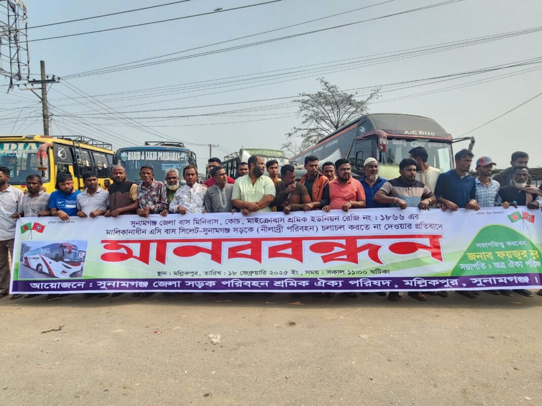 মঙ্গলবার দুপুরে শহরের মল্লিকপুর নতুন বাসস্টেশন এলাকায় অনুষ্ঠিত মানববন্ধনে এই কর্মসূচির ঘোষণা দেন সুনামগঞ্জ জেলা সড়ক পরিবহন শ্রমিক ঐক্য পরিষদের নেতারা।