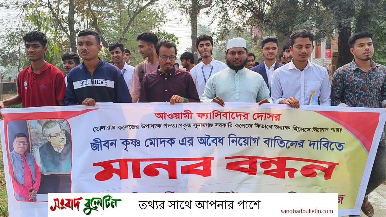 সুনামগঞ্জ সরকারি কলেজের অধ্যক্ষের নিয়োগ বাতিলের দাবিতে মানববন্ধন