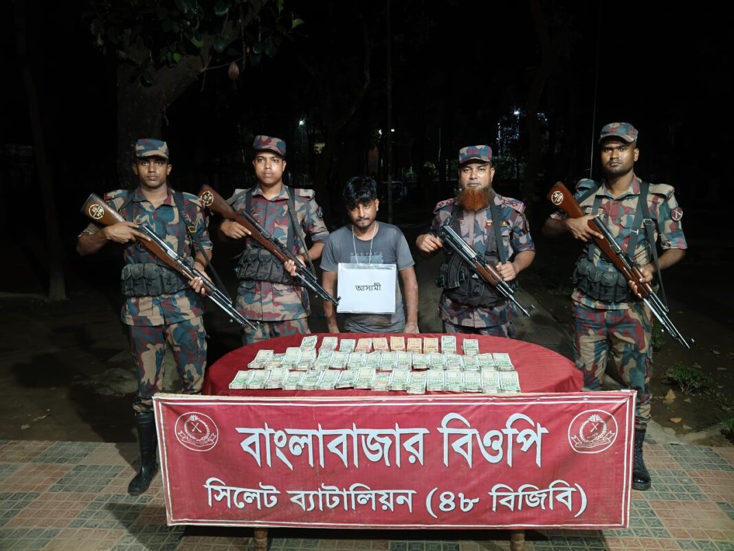 সুনামগঞ্জের দোয়ারাবাজারের সীমান্ত এলাকায় সাড়ে ১৯ লাখ ভারতীয় রুপিসহ এক তরুণকে আটক করেছে বিজিবি। বৃহস্পতিবার রাতে উপজেলার বাংলাবাজার ইউনিয়নের দক্ষিণ কলাউড়া গ্রাম থেকে তাঁকে আটক করা হয়। শুক্রবার সকালে তাঁকে দোয়ারাবাজার থানায় হস্তান্তর করা হয়।