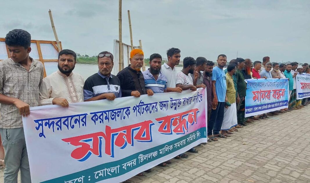 মানববন্ধনে মোংলা নাগরিক সমাজের সভাপতি মোঃ নূর আলম শেখ বলেন, বন বিভাগ প্রতি বছরের ন্যায় এ বছরও ১ জুন থেকে ৩১ আগস্ট পর্যন্ত টানা তিন মাস সুন্দরবন প্রবেশে নিষেধাজ্ঞা জারি করেছে। সুন্দরবনে নদী খালে মাছ এবং বন্যপ্রাণীদের অবাধ বিচরণ ও প্রজনন নিশ্চিত করতে এই সিদ্ধান্ত নেয়া হয়েছে। নিষেধাজ্ঞাকালীন সময়ে সুন্দরবনে মাছ ধরা ও পর্যটক নিষিদ্ধ করা হয়েছে। সুন্দরবন সুরক্ষায় এই সিদ্ধান্তকে আমরা স্বাগত জানাই, একই সাথে এই সিদ্ধান্তকে পুনঃবিবেচনা করার আবেদন জানাই। এই সিদ্ধান্তের ফলে করমজল পর্যটন কেন্দ্র ঘিরে গড়ে ওঠা শত শত মাঝিমাল্লা ও ক্ষুদ্র ব্যবসায়ীরা তারা কর্মহীন হয়ে পড়েছে। অভাবের তাড়নায় কর্মহীন এইসব মানুষেরা বিভিন্ন অপরাধ কর্মকান্ডে জড়িয়ে পড়ছে। এছাড়া মোংলা এলাকার একমাত্র পর্যটন কেন্দ্র করমজলে প্রবেশ নিষিদ্ধ হওয়াতে পর্যটক, শিশু ও ভ্রমণপিপাসুরা নিরুপায় হয়ে পড়েছে। করমজল যেহেতু সুন্দরবনের প্রবেশমুখে অবস্থিত এবং ডে ভিজিটর সেন্টার হওয়ায় এখানে রাতে অবস্থান করার কোন সুযোগ নেই। তাছাড়া এখানে ঘোরাঘুরির জন্য সাময়িক পাশ দেয়া হয় এবং বিকেল ৪টার পর কোন ভাবেই অবস্থান করা যায়না। নির্দিষ্ট গন্ডির মধ্যে চিড়িয়াখানার আদলে গড়ে তোলা করমজলে পর্যটক আগমনে সুন্দরবনের বন্যপ্রাণীদের অবাধ বিচরণ ও প্রজনন কাজে ব্যাঘাত ঘটার সম্ভাবনা নাই বললে চলে। তাই ডে ভিজিটর সেন্টার সুন্দরবনের করমজল পর্যটন কেন্দ্রকে তিন মাসের নিষেধাজ্ঞার আওতার বাইরে রাখতে হবে। করমজলে পর্যটক প্রবেশে নিষেধাজ্ঞা বহাল থাকলে পর্যটন ব্যবসার সাথে যুক্ত মাঝিমাল্লাসহ ক্ষুদ্র ব্যবসায়ীদের জীবন-জীবিকা রক্ষায় বিশেষ ভাতা/সহায়তা প্রদান করতে হবে।সুন্দরবনকেন্দ্রিক পর্যটন শিল্প’র উন্নয়ন ঘটাতে পর্যটন ব্যবসায়ীদের বিনাসুদে ব্যাংক ঋণ ও বিশেষ প্রণোদনা দিতে হবে।