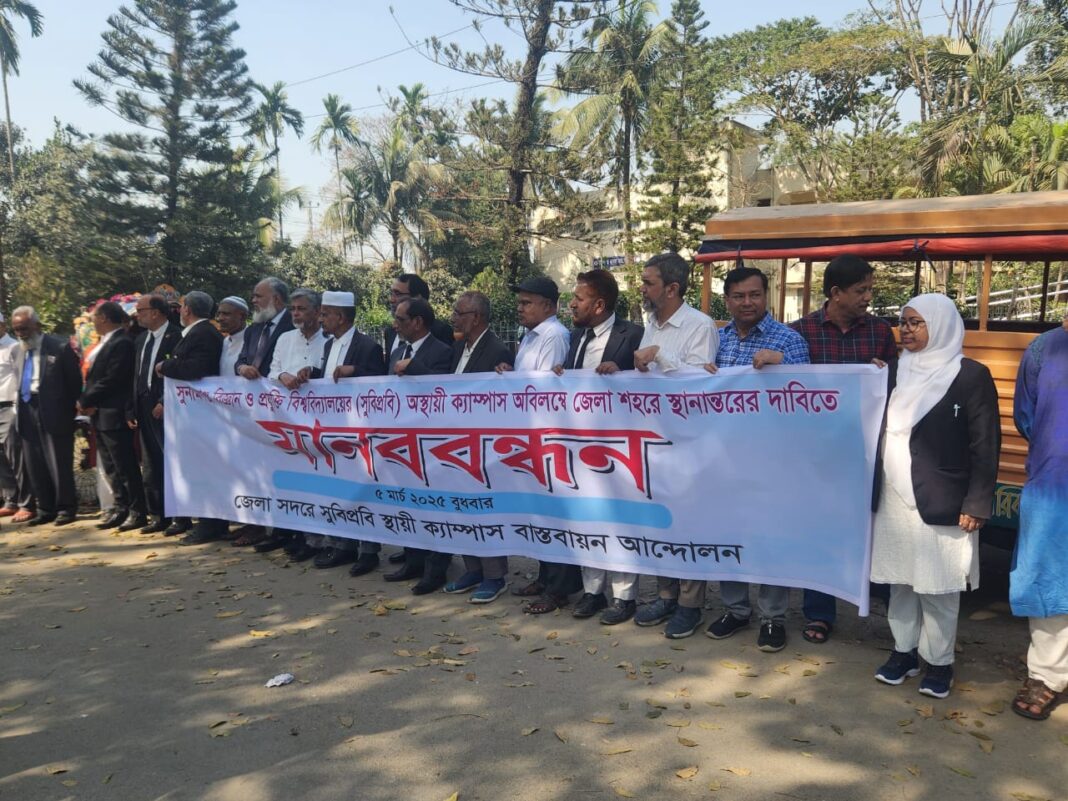 সুবিপ্রবি’র অস্থায়ী ক্যাম্পাস স্থানান্তরের দাবিতে সুনামগঞ্জে মানববন্ধন