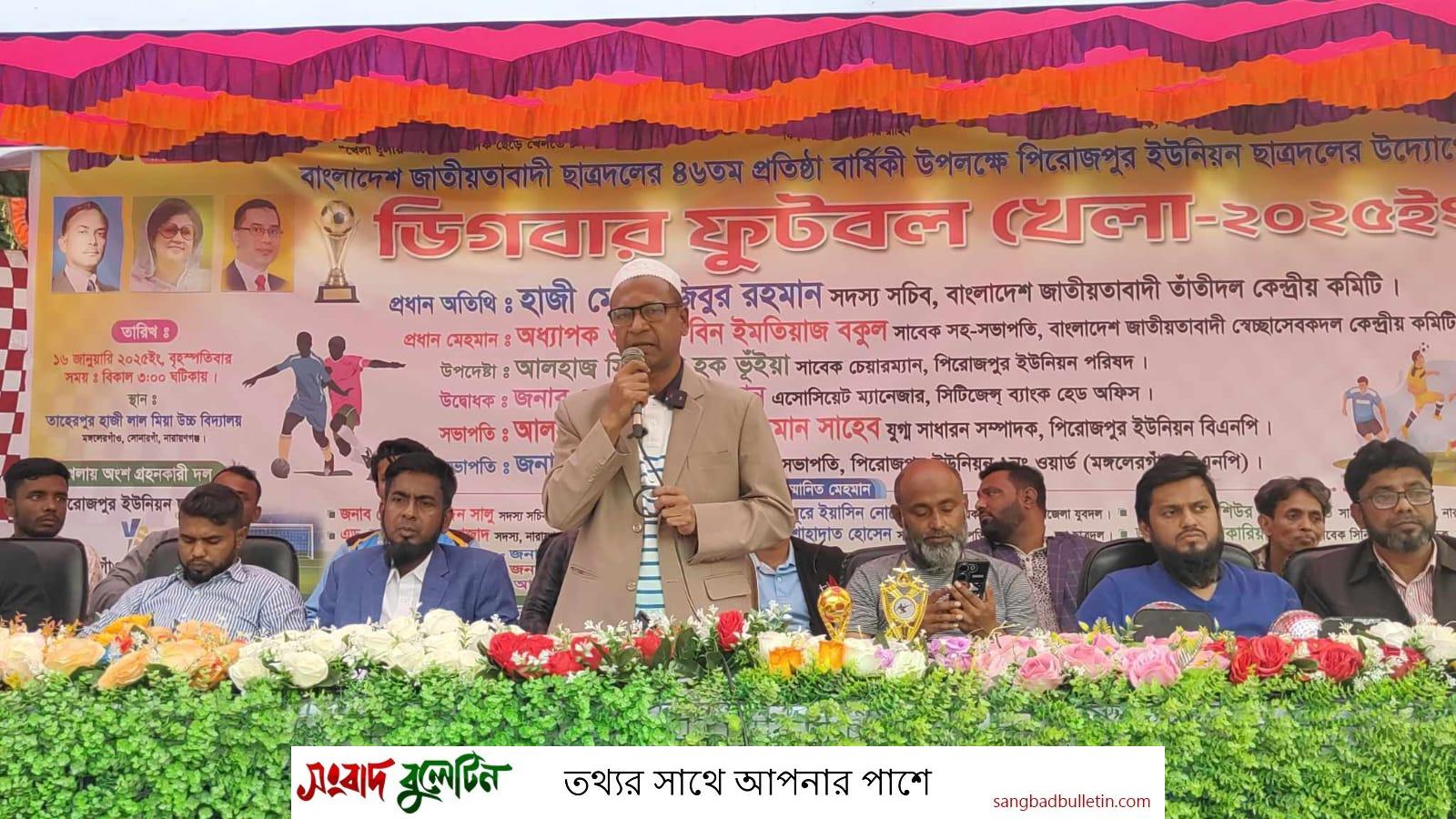 জাতীয়তাবাদী ছাত্রদলের ৪৬ তম প্রতিষ্ঠাবার্ষিকী উপলক্ষে সোনারগাঁয়ে ডিগবার ফুটবল খেলার আয়োজন করা হয়েছে। গতকাল বৃহস্পতিবার বিকেলে উপজেলার পিরোজপুর ইউনিয়নের মঙ্গলেরগাঁও তাহেরপুর উচ্চ বিদ্যালয় মাঠে এ খেলা অনুষ্ঠিত হয়। খেলার পুরস্কার বিতরণী অনুষ্ঠানে প্রধান অতিথি ছিলেন কেন্দ্রীয় স্বেচ্ছাসেবক দলের সাবেক সহসভাপতি অধ্যাপক ওয়াহিদ বিন ইমতিয়াজ বকুল। কাপ্তান বাজার সমিতির সিনিয়র সহ-সভাপতি মোঃ আতাউর রহমানের সভাপতিত্বে খেলা উদ্বোধন করেন সিটিজেন্স ব্যাংকের এসোসিয়েট ম্যানেজার মোহাম্মদ রকিবুল হাসান,