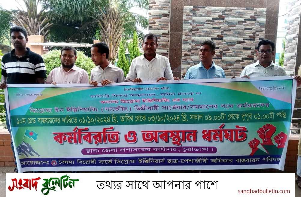 মঙ্গলবার (১ অক্টোবর) সকাল সাড়ে ১০টার দিকে চুয়াডাঙ্গা জেলা প্রশাসকের কার্যালয় প্রাঙ্গণে এ কর্মবিরতি ও অবস্থান ধর্মঘট কর্মসূচি পালন করা হয়।