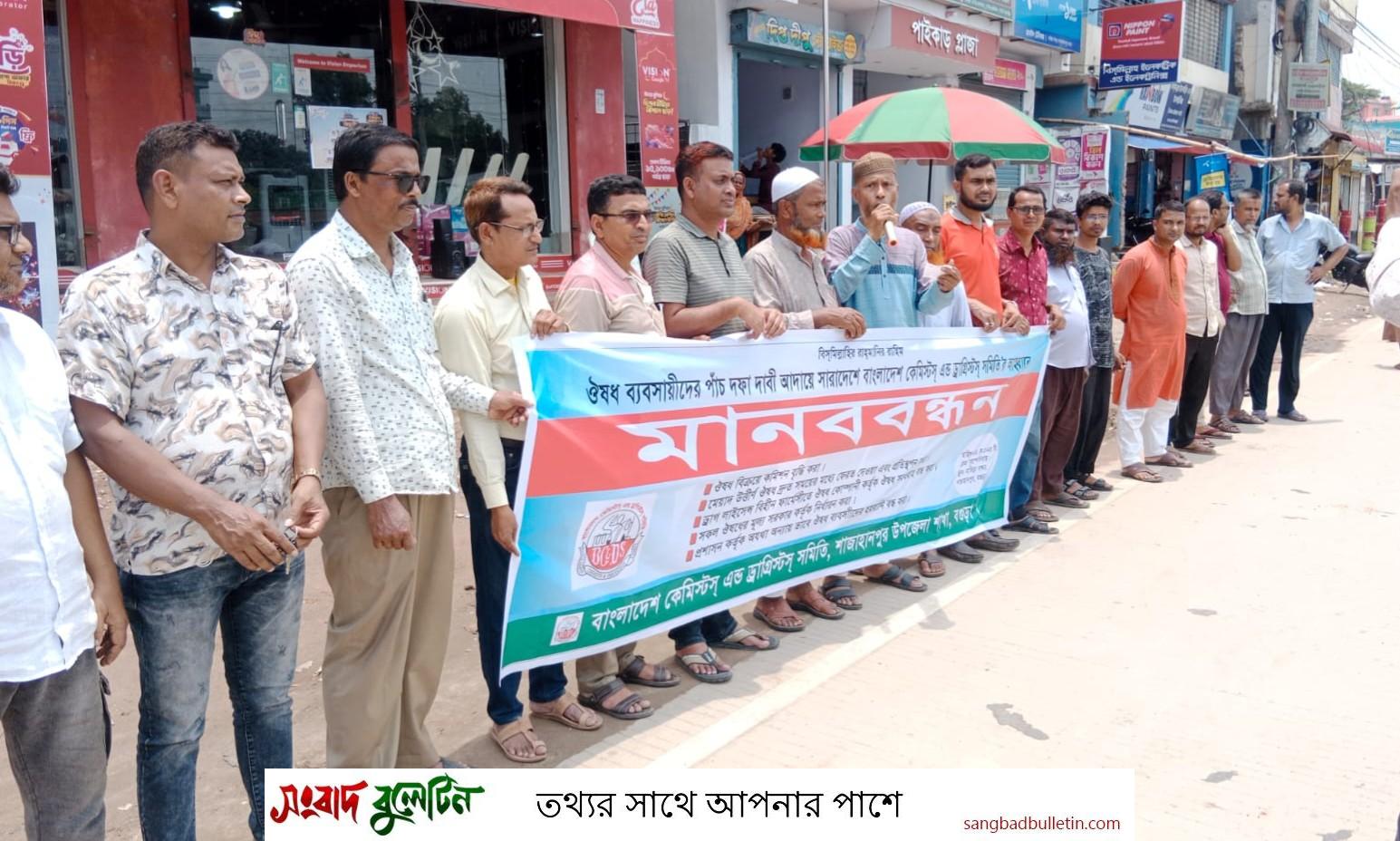 বাংলাদেশ কেমিস্টস এন্ড ড্রাগিস্টস সমিতি, শাজাহানপুর উপজেলা শাখার উদ্যোগে ৫ দফা দাবিতে মানববন্ধন ও সমাবেশ অনুষ্ঠিত হয়েছে। বৃহস্পতিবার (২২ মে) সকাল ১১টায় উপজেলার মাঝিড়া বাসস্ট্যান্ডের মহাসড়কের পূর্ব পাশে এ কর্মসূচি পালিত হয়।