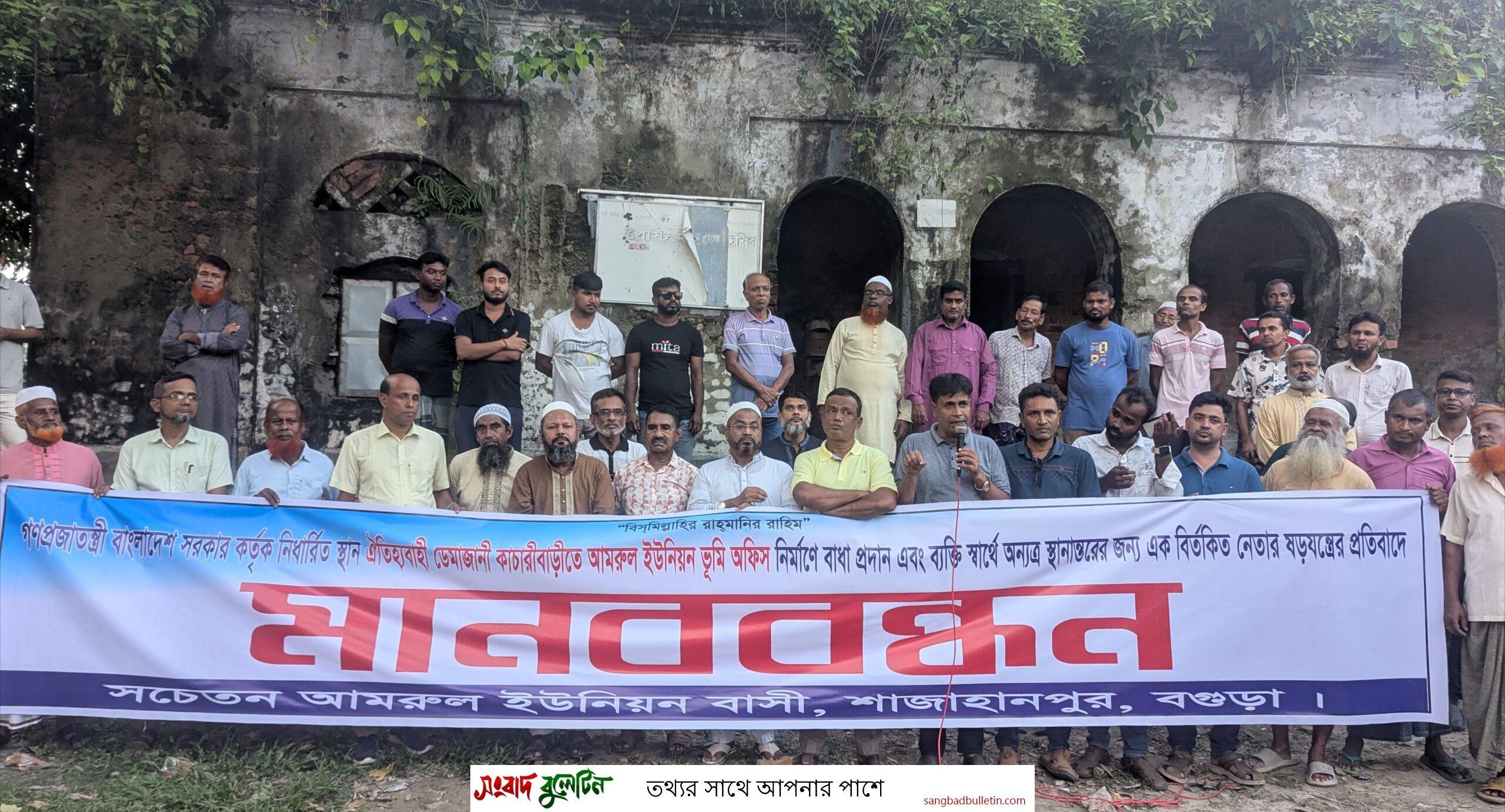 বগুড়া শাজাহানপুরের ডেমাজানী ঐতিহ্যবাহী কাচারী বাড়িতে আমরুল ইউনিয়ন ভূমি অফিস নির্মাণে বাধা প্রদান ও স্থানান্তরের ষড়যন্ত্রের প্রতিবাদে এলাকাবাসীর উদ্যোগে মঙ্গলবার বিকেল ৪টায় মানববন্ধন অনুষ্ঠিত হয়েছে।