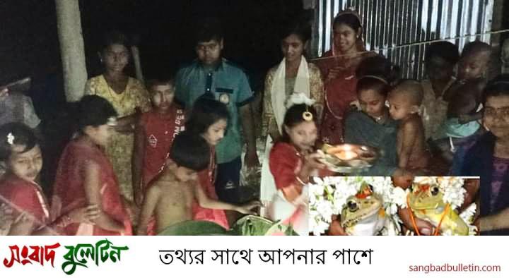 ঢাক, ঢোল, সানাই বাজিয়ে, বরণ ডালা সাজিয়ে ও বিভিন্ন আঞ্চলিক গান গেয়ে বৃষ্টির আশায় সাজ সাজ রব ও নেচেছেন আয়োজকরা। তীব্র তাপ প্রবাহে বগুড়ার আদমদীঘি উপজেলার সদর মাঝিপাড়া গ্রামে হিন্দু ধর্মাবলম্বীরা ব্যাঙ-ব্যাঙের বিয়ের আয়োজন করেছে। গত বুধবার রাতে ধর্মীয় রীতি অনুযায়ী মাঝিপাড়া গ্রামের হিমো সাধুর বাড়িতে ছায়া মন্ডব তৈরি, প্রদীপ প্রজ্জ্বলন, চলন ডালা প্রজ্জ্বলন এবং ঘণ্টা, ঘণ্টা ও বাদ্যযন্ত্র বাজানো হয়। খেলা বিয়েতে ছেলে ব্যাঙের নাম আকাশ এবং মেয়ে ব্যাঙের নাম বৃষ্টি। বিয়ের অনুষ্ঠান শেষে বর যাত্রী দুটি ব্যাঙ নিয়ে গোটা গ্রাম প্রদক্ষিণ করার পর ছায়া মন্ডব প্রাঙ্গণে বর ও কনে পক্ষের প্রায় দুই শতাধিক মানুষের জন্য ভোজের আয়োজন করা হয়। বঙ্গ-বঙ্গচির বিয়ের আয়োজনকারী রত্না রানী, সনেকা বালা, চন্দনা রানী, তাপসী রানী, অলোকা রানী, কুমারী অন্নেশা, কুমারী রিয়া, কুমারী সয়া জানান, চলমান তাপ প্রবাহে মানুষ স্বস্তিতে কাজ করতে পারছে না। আগেকার দিনে ব্যাগ বিয়ে হলে বৃষ্টি হবে এই বিশ্বাসের ভিত্তিতে ব্যাগ ম্যারেজ আয়োজন করা হয়েছে।