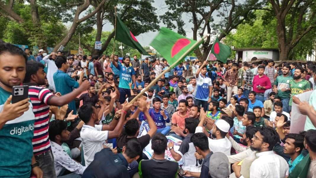এসময় শিক্ষার্থীরা আঠারোর হাতিয়ার, গর্জে উঠুক আরেকবার। জেগেছে রে জেগেছে, ছাত্রসমাজ জেগেছে। লেগেছে রে লেগেছে, রক্তে আগুন লেগেছে। আপস না সংগ্রাম, সংগ্রাম সংগ্রাম। মুক্তিযুদ্ধের বাংলায়, বৈষম্যের ঠাঁই নাই- ইত্যাদি স্লোগান দিতে থাকেন।