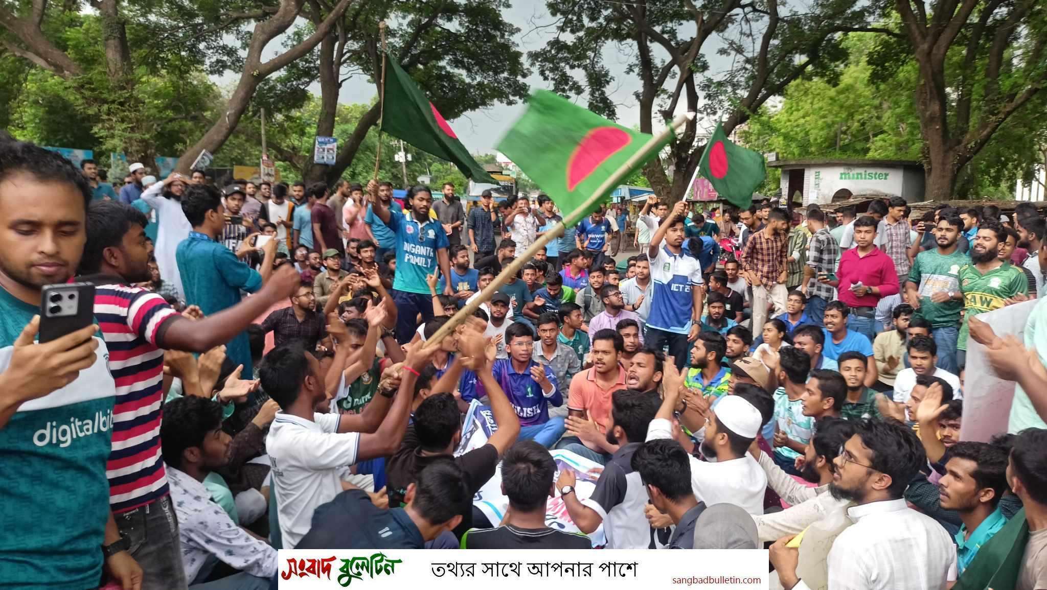 এসময় শিক্ষার্থীরা আঠারোর হাতিয়ার, গর্জে উঠুক আরেকবার। জেগেছে রে জেগেছে, ছাত্রসমাজ জেগেছে। লেগেছে রে লেগেছে, রক্তে আগুন লেগেছে। আপস না সংগ্রাম, সংগ্রাম সংগ্রাম। মুক্তিযুদ্ধের বাংলায়, বৈষম্যের ঠাঁই নাই- ইত্যাদি স্লোগান দিতে থাকেন।