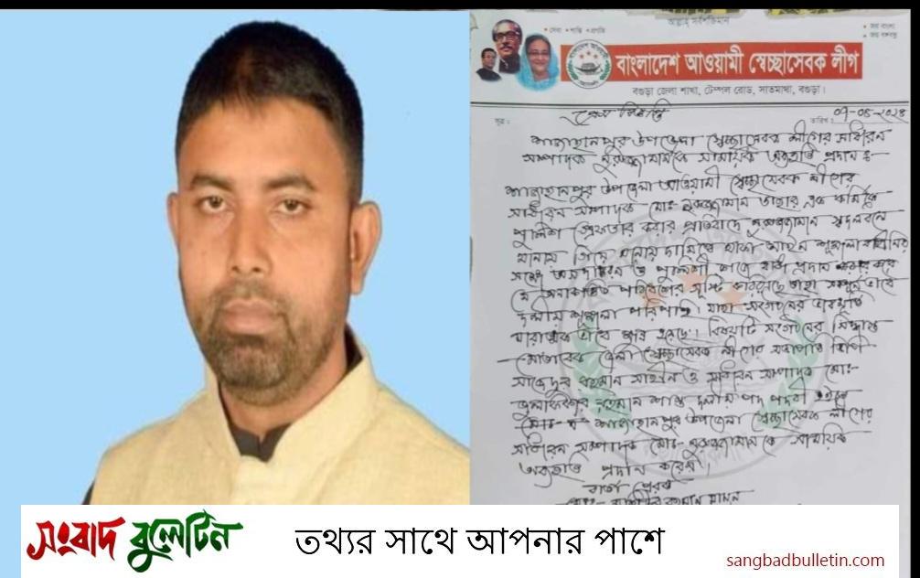 বিজ্ঞপ্তিতে বলা হয়, দলীয় এক কর্মীকে পুলিশ গ্রেপ্তার করার প্রতিবাদে শাজাহানপুর উপজেলা স্বেচ্ছাসেবক লীগের সাধারণ সম্পাদক নুরুজ্জামান দলবল নিয়ে থানায় গিয়ে দায়িত্বরত পুলিশ সদস্যদের সঙ্গে অসদাচরণ করেন এবং পুলিশি কাজে বাধা দেন। যা সম্পূর্ণ দলীয় শৃঙ্খলা পরিপন্থী। এতে সংগঠনের ভাবমূর্তি মারাত্মকভাবে ক্ষুণ্ন হয়েছে। দলীয় সিদ্ধান্ত মোতাবেক জেলা আওয়ামী স্বেচ্ছাসেবক লীগের সভাপতি সাজেদুর রহমান সাহীন ও সাধারণ সম্পাদক জুলফিকার রহমান শান্ত দলীয় পদ-পদবি থেকে নুরুজ্জামানকে অব্যাহতি দিয়েছেন।
